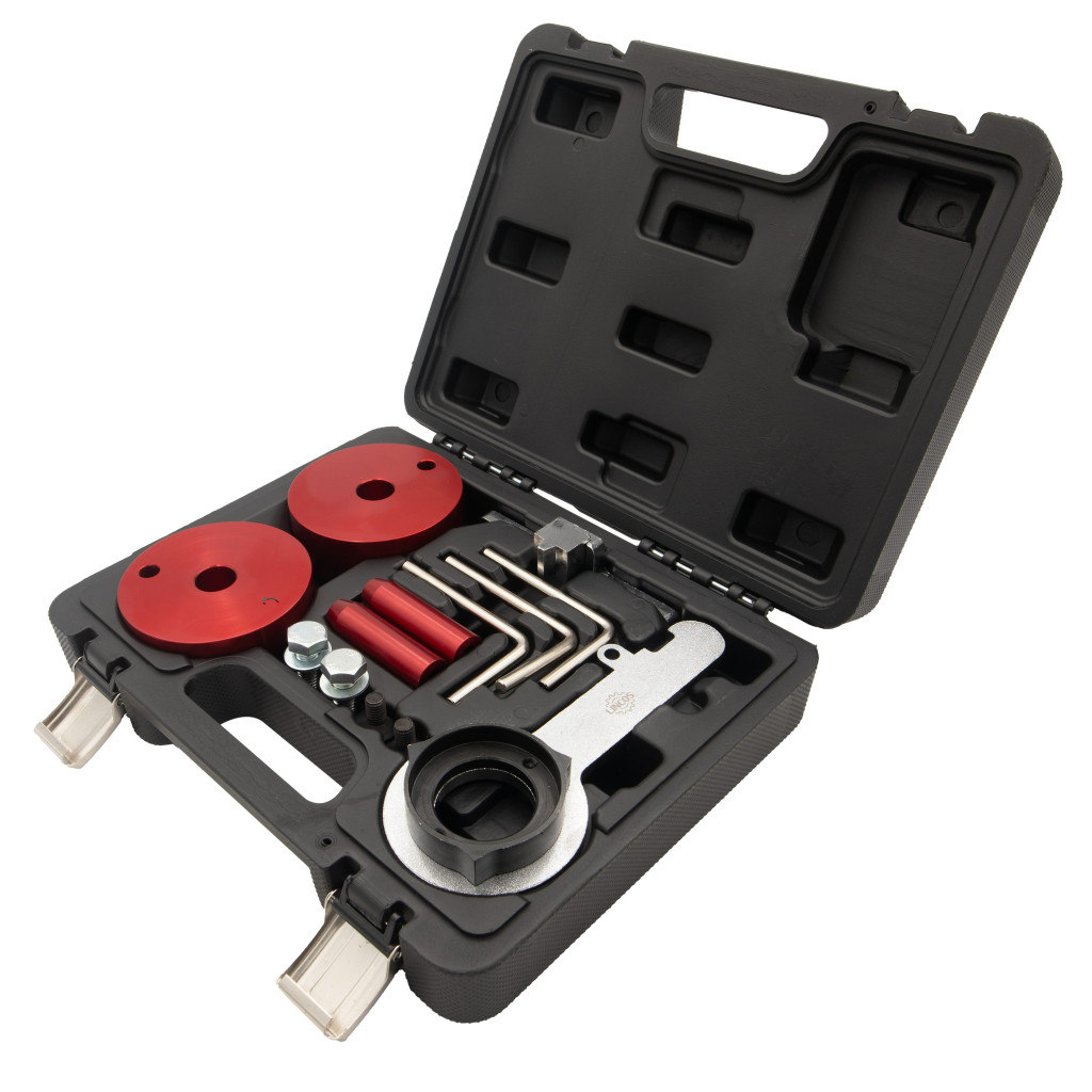 Vezérműszíj beszerelési eszközök : A készlet alapvető eszközöket tartalmaz a vezérműszíj vezérműtengelyekre való felszereléséhez, ami kritikus eljárás a motor karbantartása során.