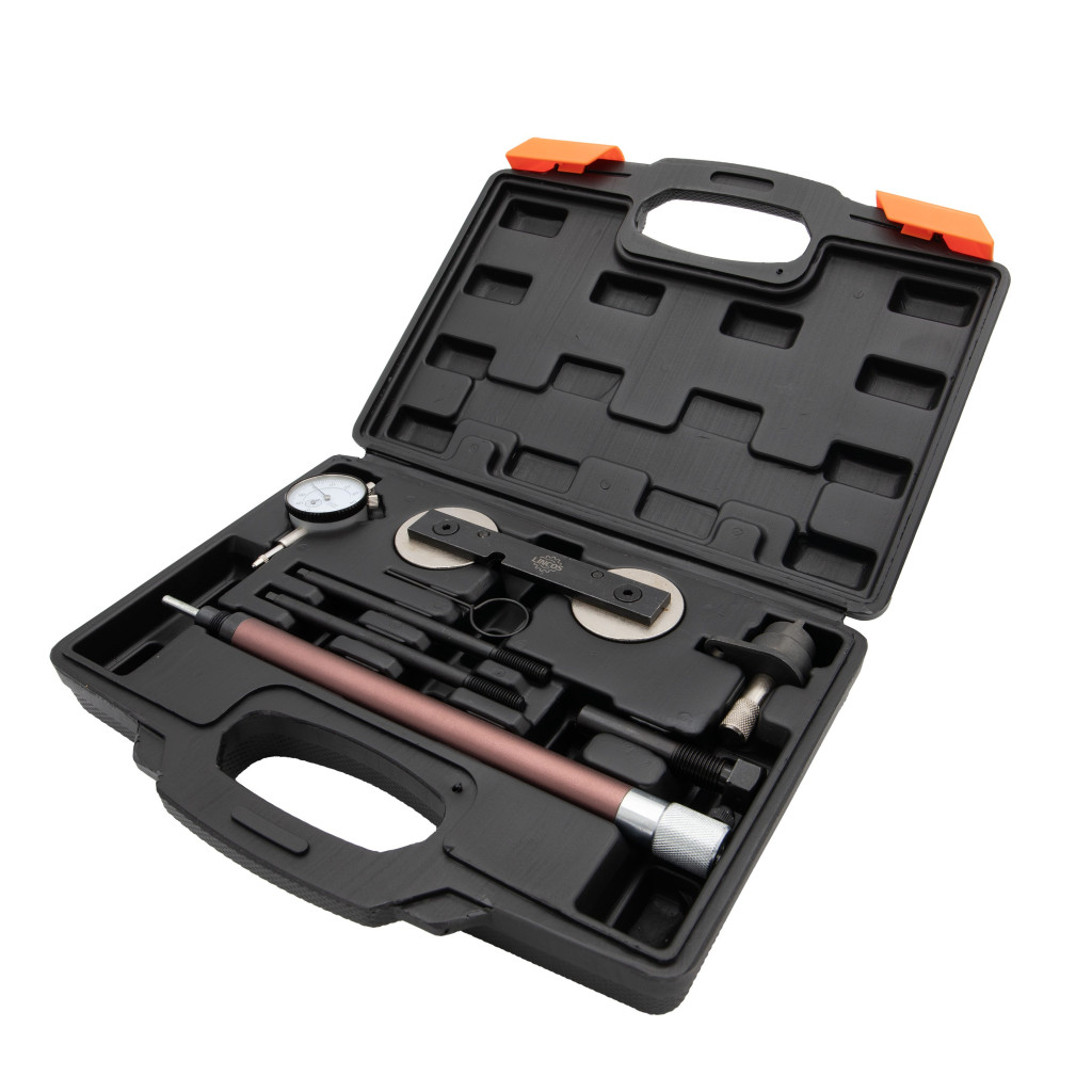 Komplett készlet : Tartalmazza a vezérműtengely reteszelő szerszámot, a mérőórás tesztjelzőt, a TDC (Top Dead Center) jelzőt, a vezérműtengely beállító szerszámot, a feszítőcsapot, a főtengely rögzítőcsapját és a vezetőcsapokat. A szerszámok széles választéka biztosítja, hogy minden meglegyen, ami a motor pontos időzítéséhez és beállításához szükséges.