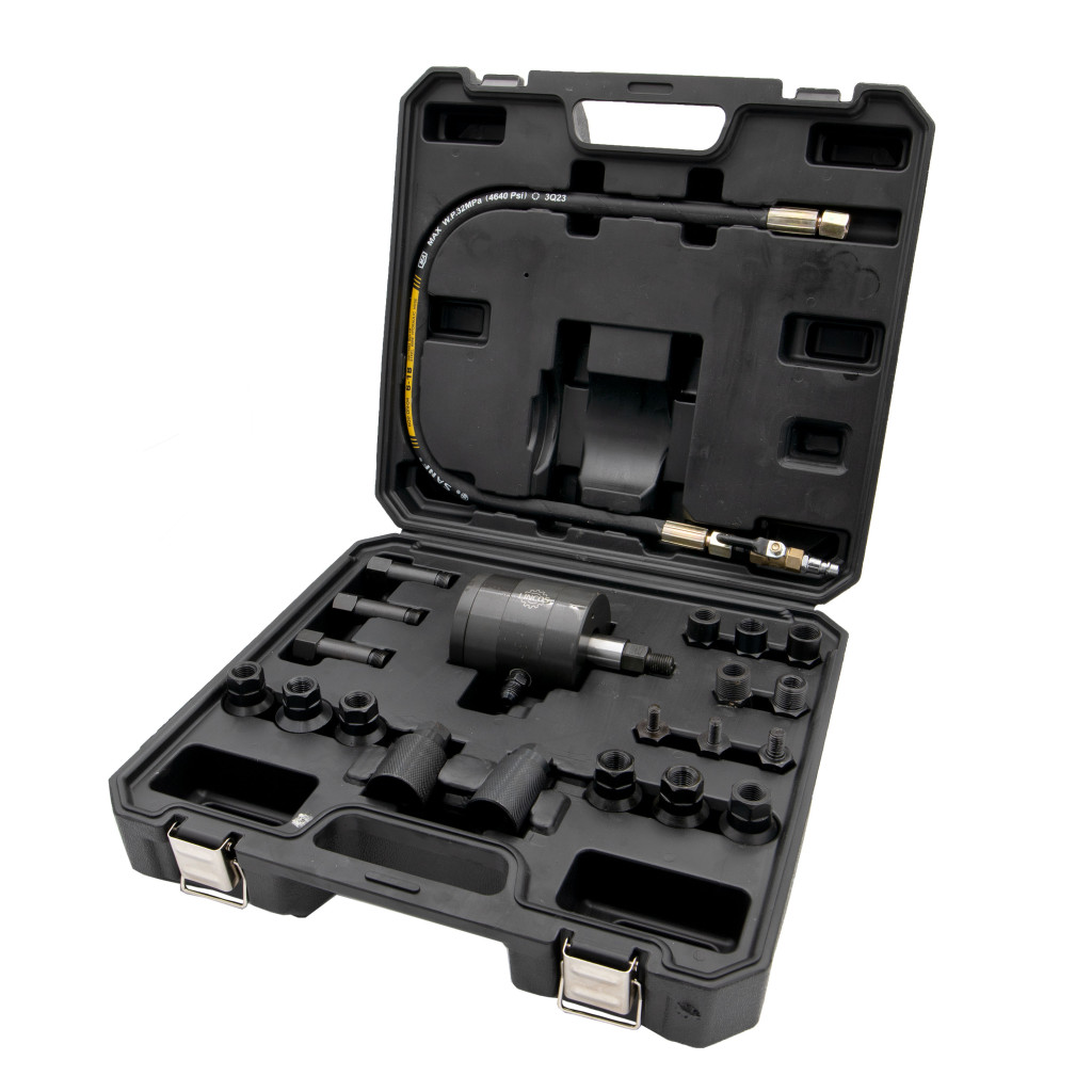 Pneumatikus injektor lehúzó készlet, 21 db egy speciális szerszámkészlet, amelyet az autómotorok befecskendező szelepeinek pneumatikus erővel történő eltávolítására terveztek. Fekete BMC táska (Blow Molded Case) a tároláshoz.