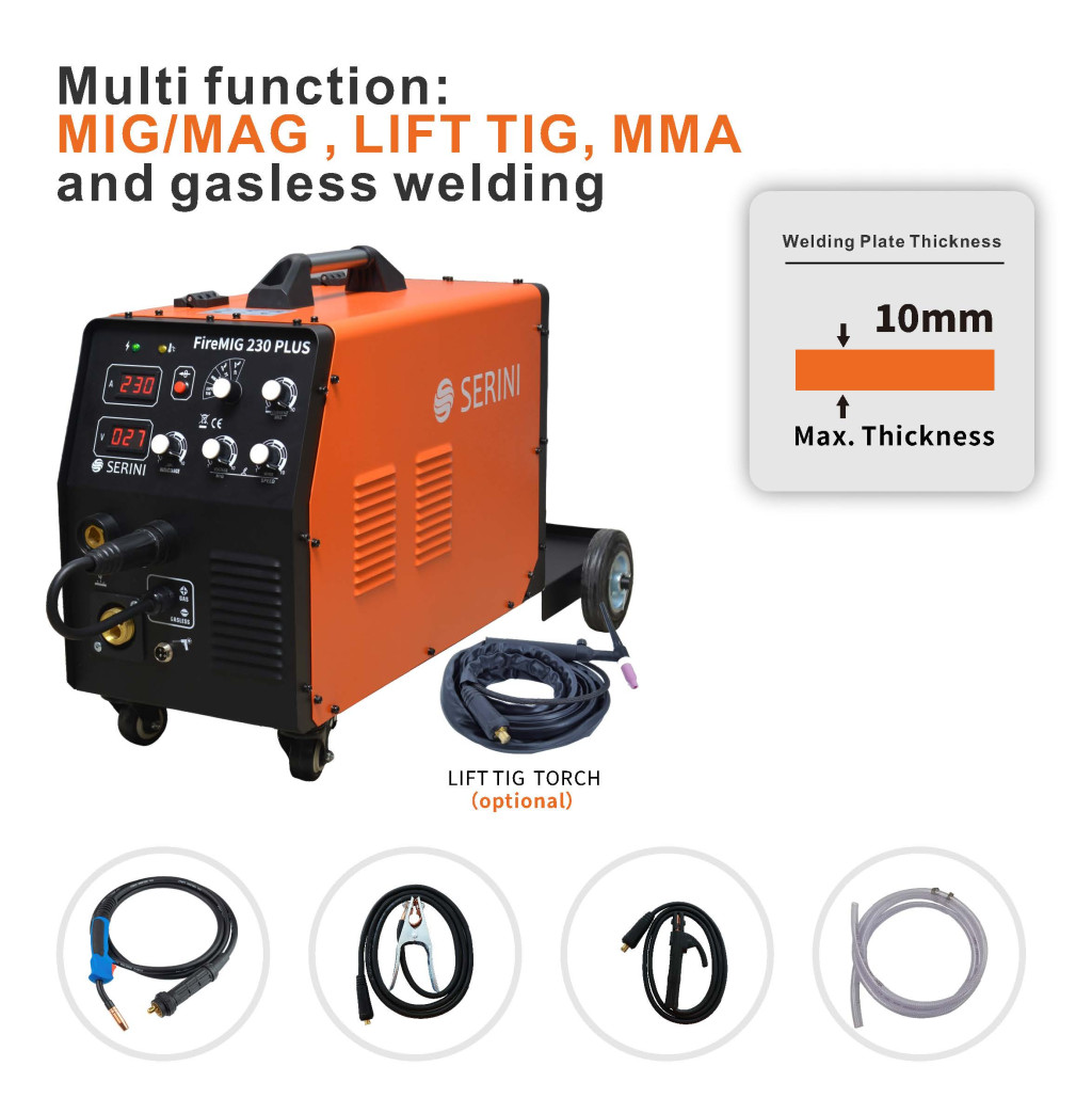 A FireMIG 230 PLUS IGBT inverteres hegesztőgépet sokoldalú teljesítményre tervezték különféle hegesztési technikákhoz, beleértve a MIG/MAG, Lift TIG, MMA és gázmentes hegesztést. A 220V/50Hz/1ph tápellátás a legmodernebb IGBT inverter technológiával rendelkezik a stabil, hatékony hegesztés érdekében.