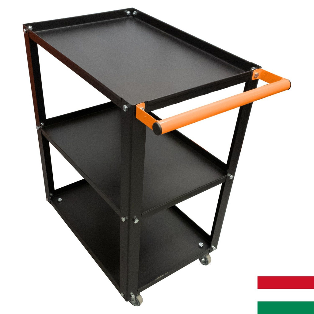 Három polcos gurulós műhelykocsi szerszámtartóval, tárolási és szállítási lehetőséget nyújt a szerszámoknak illetve kisebb gépeknek.