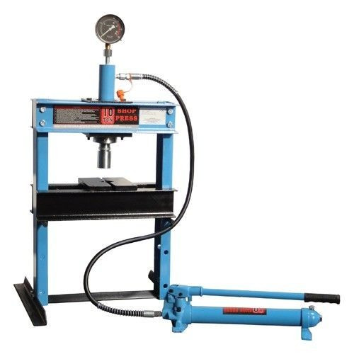 Hidraulikus műhelyprés, nyomóerő 10t, löket 135mm, max. munkahossz 358mm, munkaasztal méret kb. 400x180mm. Kivitele miatt akár műhelyasztalra is helyezhető.