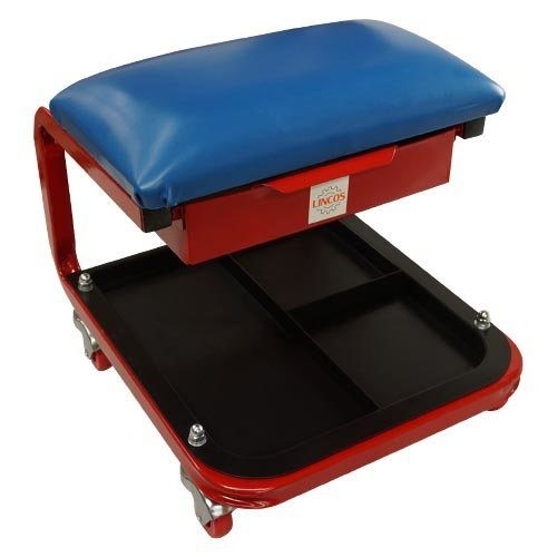 Szerelőszék szerszámtartóval a talpazaton és az ülőrész alatt, szabadon kormányozható kerekek, méret 440x360x365mm
