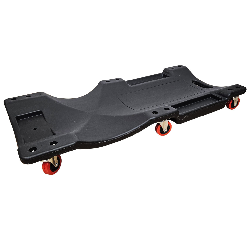 6 kerekes gurulós plastic szerelőágy, tároló és lerakóhelyekkel, szabadon kormányozható kerekek, méret 915x435x100mm, terhelhetőség 80kg, párnás fejtámasz nélkül