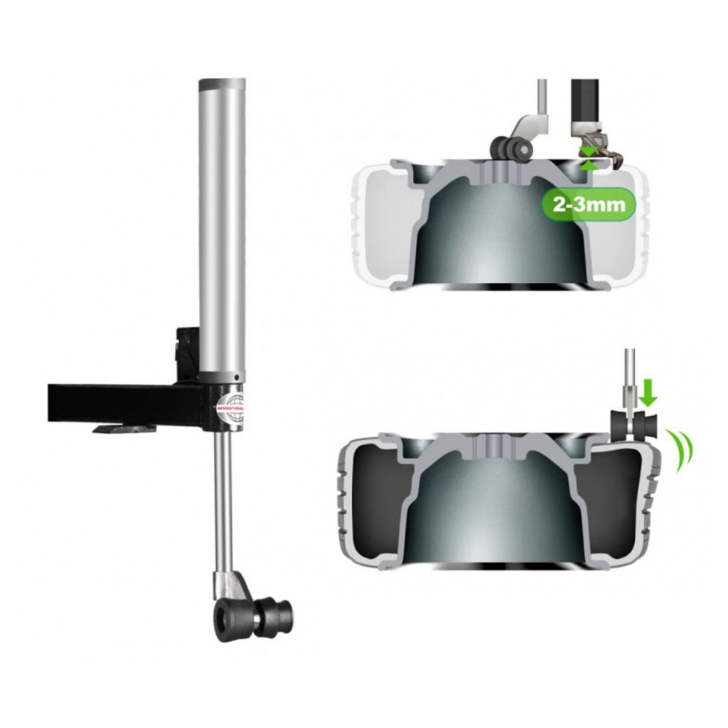 - Erősítse a présgörgőt a rögzítő / leszerelő fej mögött, tartson 2-3 mm közötti távolságot a gumiabroncs és a rögzítő / leszerelő fej között, megakadályozva a felni karcolódását szerelés közben.