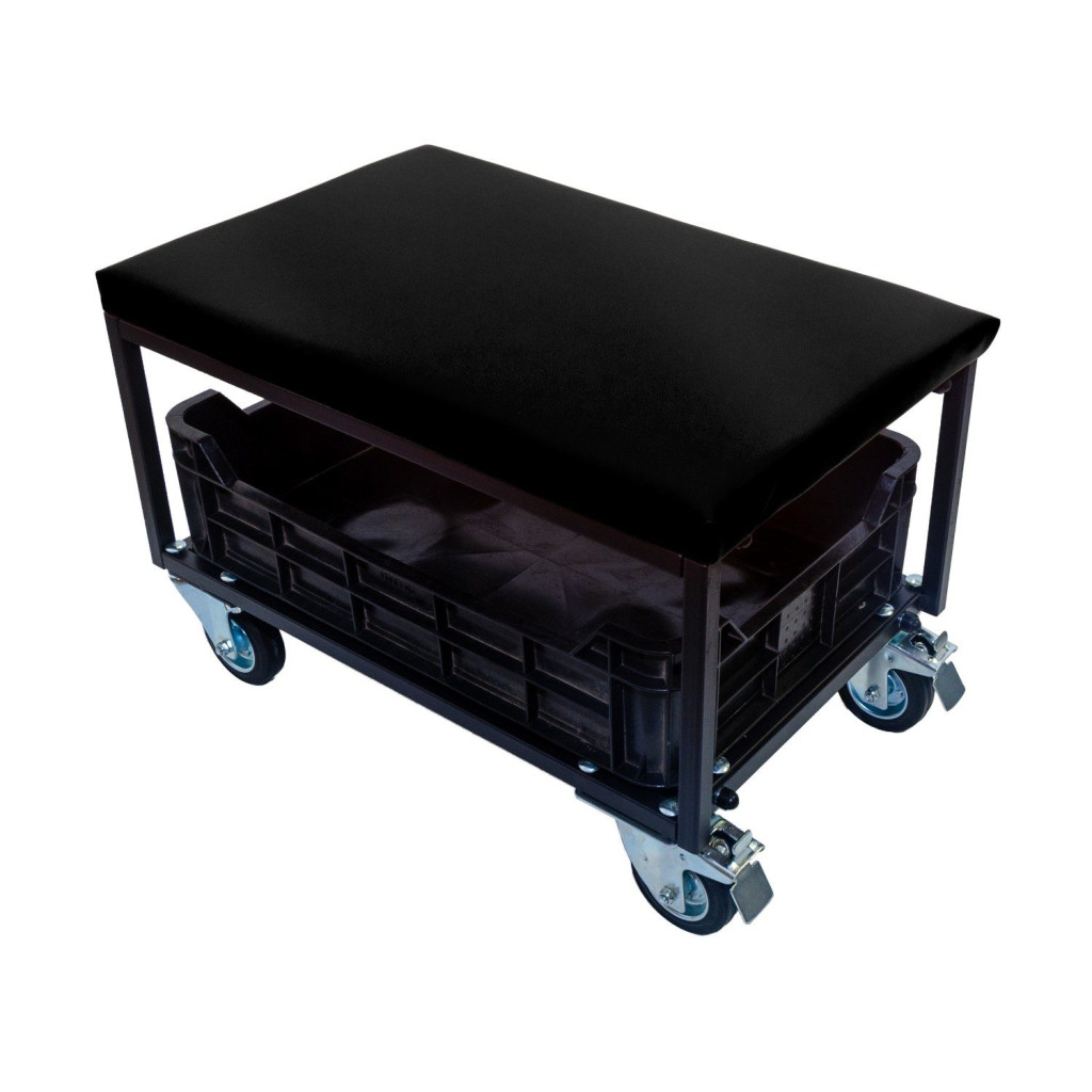 Szerelőszék M10-es kivehető tároló ládával, 2 fix és 2 szabadon kormányozható kerékkel, hasznos ülő felület 650x405 mm, magasság 450 mm. Fekete. Magyar termék!